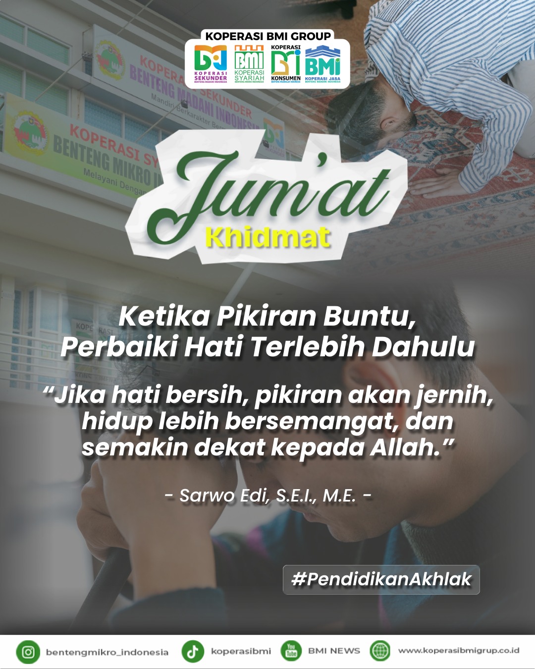 Tangerang, Klikbmi.com: Dalam nasehat rutin Jumat Khidmat di Koperasi BMI Group, Pengawas Syariah Koperasi Syariah Benteng Mikro Indonesia, Ustadz Sarwo Edi, menyampaikan nasehat bertema pentingnya memperbaiki hati saat menghadapi kebuntuan dalam hidup.