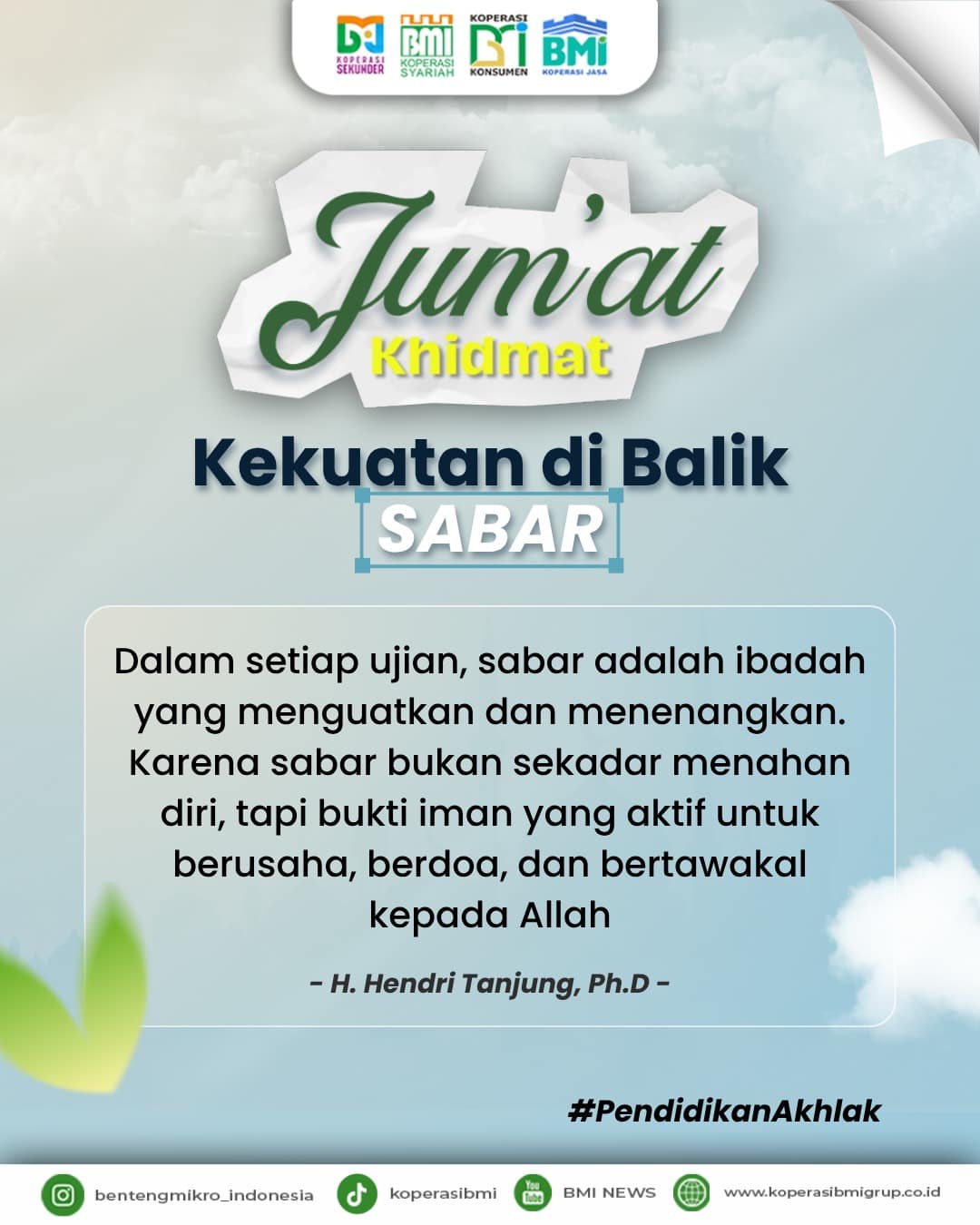 Tangerang, Klikbmi.com: Dalam rangkaian Jum’at Khidmat yang digelar Koperasi BMI Group, Pengawas Syariah Koperasi Syariah BMI, Hendri Tanjung, kembali memberikan tausiah kepada seluruh karyawan Koperasi BMI Group. Pada kesempatan kali ini, ia melanjutkan tema pendidikan akhlak yang sebelumnya membahas tentang shalat berdasarkan Surat Al-Mu’minun ayat 1–11. Sesi kali ini difokuskan pada salah satu aspek penting dalam pendidikan akhlak, yakni sabar.