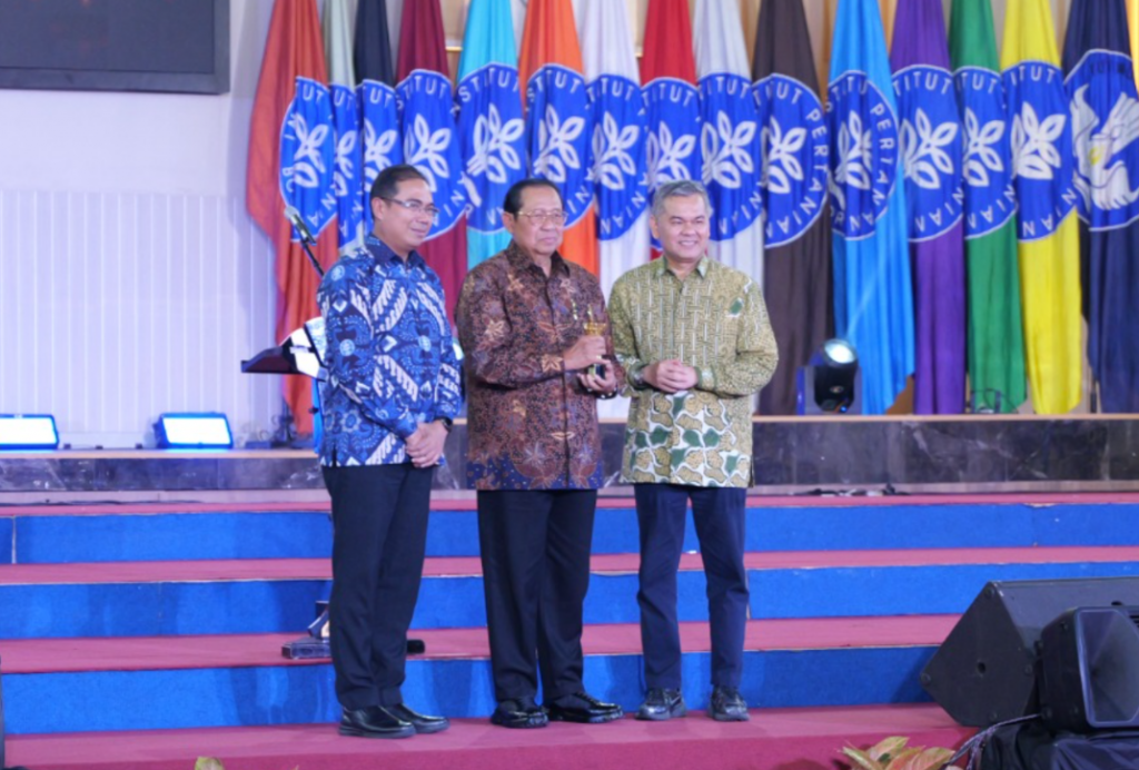 SBY (tengah) menerima penghargaan super alumni prominent dari Rektor IPB (kiri) bersama Walneg S Jas Ketua Umum HA IPB University